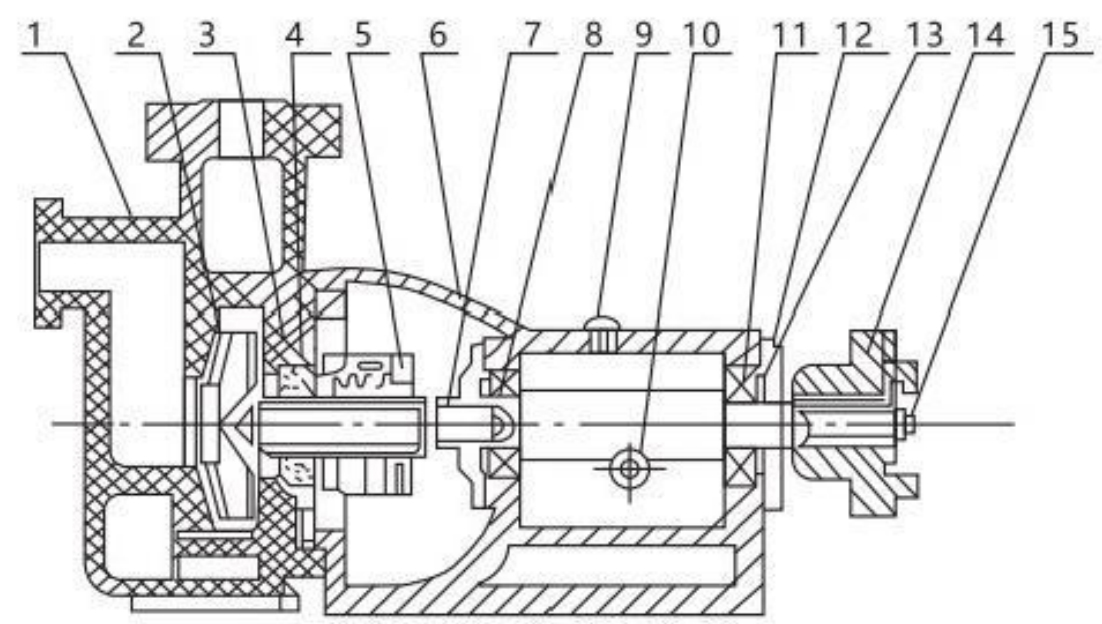 | 9 Couvercle d'huile | 10 Voyant d'huile | 11 Roulement | Presse-étoupe 12 | 13 Joint d'huile | 14 Accouplement | 15 Boulon de serrage |