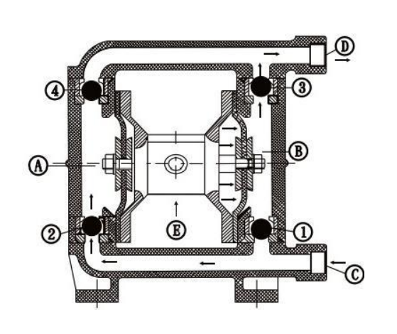 2. Le liquide est aspiré par l'orifice d'entrée ③ lorsque la section A se dilate. Lorsque le liquide pénètre dans la section ④, le robinet à bille ② s'ouvre et le robinet ④ se ferme.
