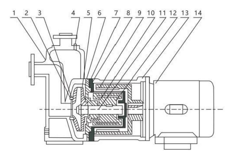 | 1 | Corps de pompe | 5 | Turbine | 9 | Ensemble magnétique externe | 13 | Cadre de liaison |